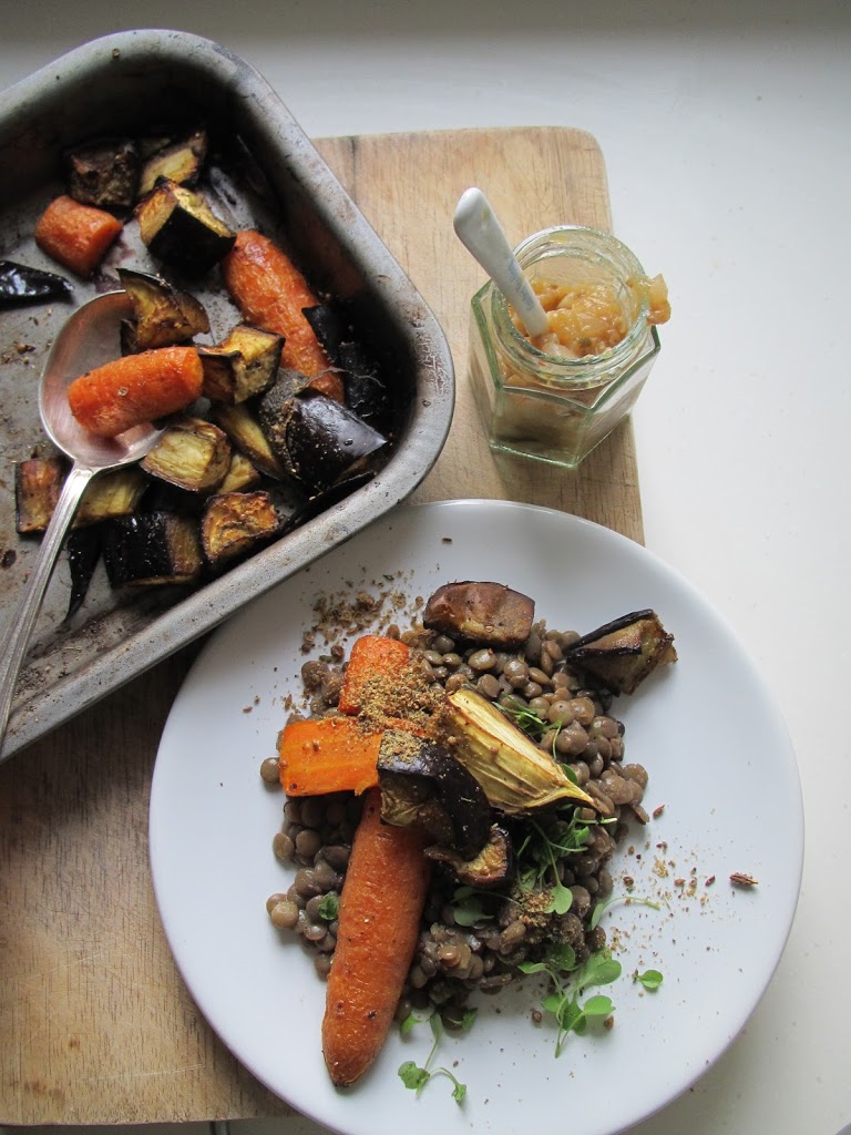 My brain was whirring away in the background, dreaming up ways to improve on it. The next day I had a ‘Ground Hog’ moment. I repeated the process….with changes. I transformed the relish into a chutney. I added a chopped eating apple, a finely sliced garlic clove, and one tablespoon of apple cider vinegar and let it bubble on the stove for 25 minutes and the let it cool and thicken. I cubed the aubergine and roasted it with carrots and a generous splash of olive oil. I then scattered some of the dukkah over the vegetables and let the oven (220 degrees) roast and deepen the flavours for 30 mins. I served it all on a bed of seasoned Puy and green lentils, and quite frankly, it rocked my world. Isn’t it exciting when a recipe morphs into something surprisingly good?!