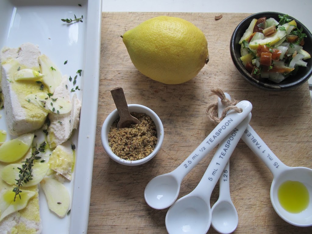 I stuck to the original recipe for the lemon and date relish but I baked, hard vegan cheese in place of the feta.