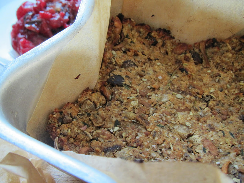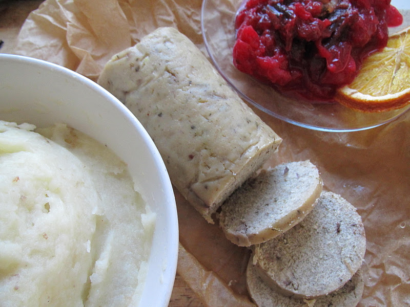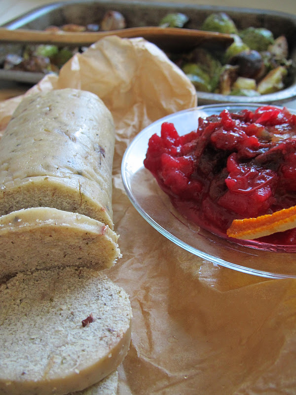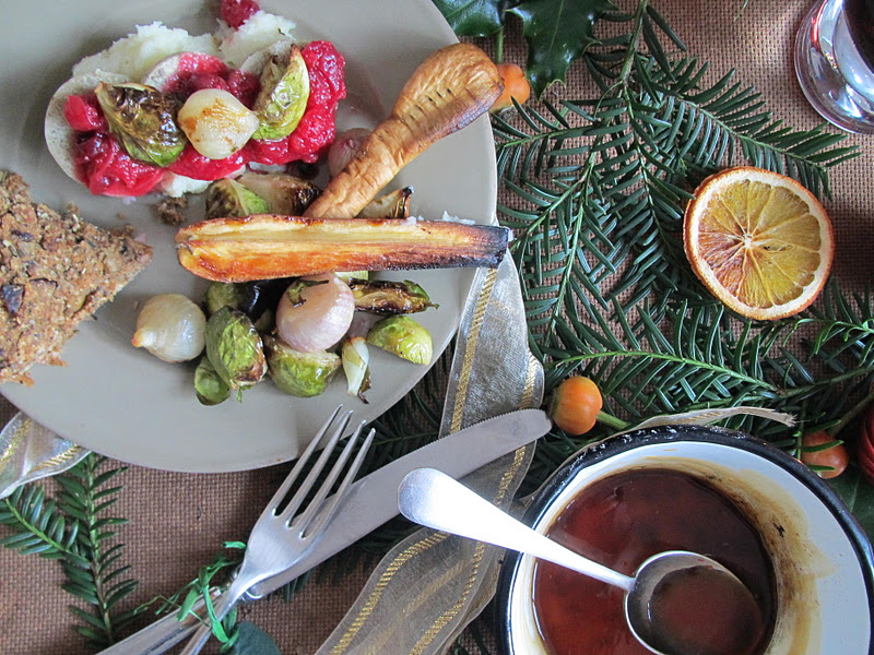 Brussels sprouts, shallots, fresh sage, thyme, celeriac, white potatoes, parsnips, dried mushrooms, green tea bag, cranberries, oranges, tofurkey or whatever vegan roast you are partial to, paprika, organic apricots, gluten-free breadcrumbs, pears or apples, tamari sauce, chestnuts…salt & pepper.