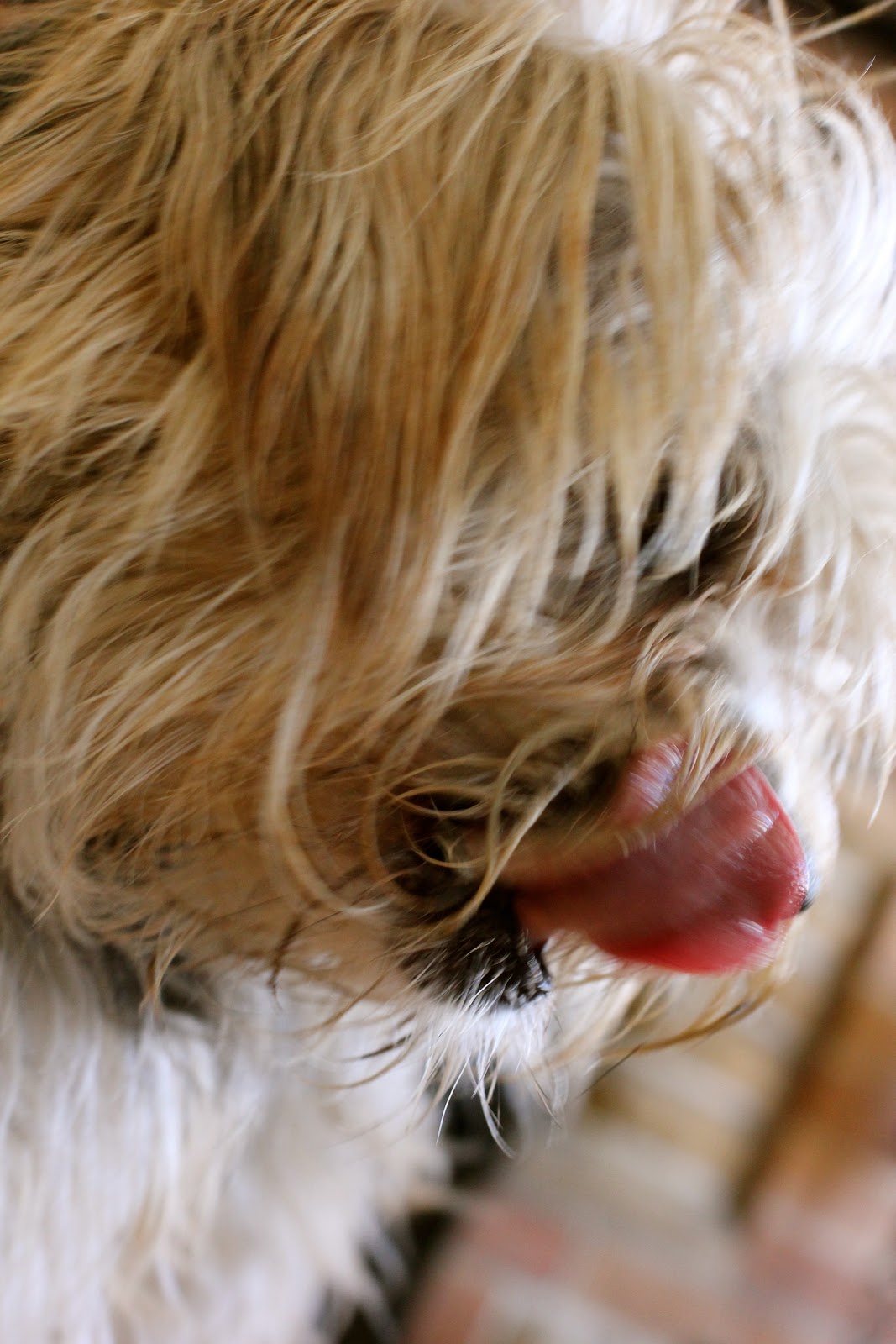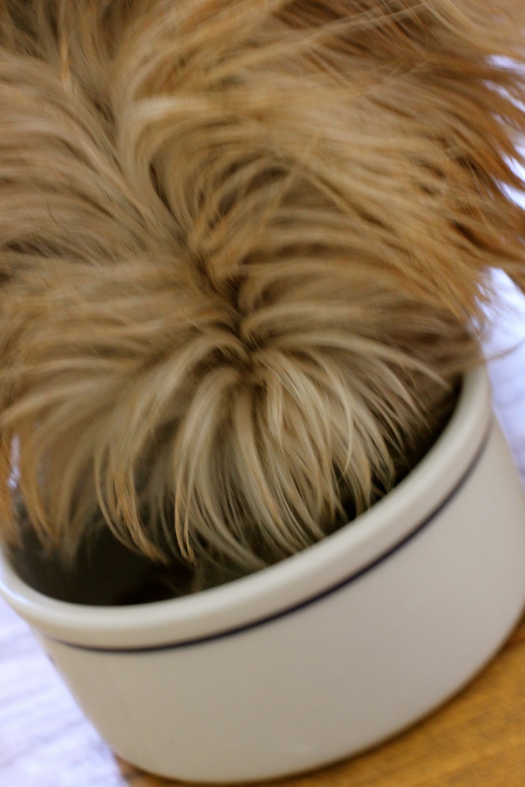 | eager dog! the bowl travelled around the room in her efforts to lap up all the V-Dog. |