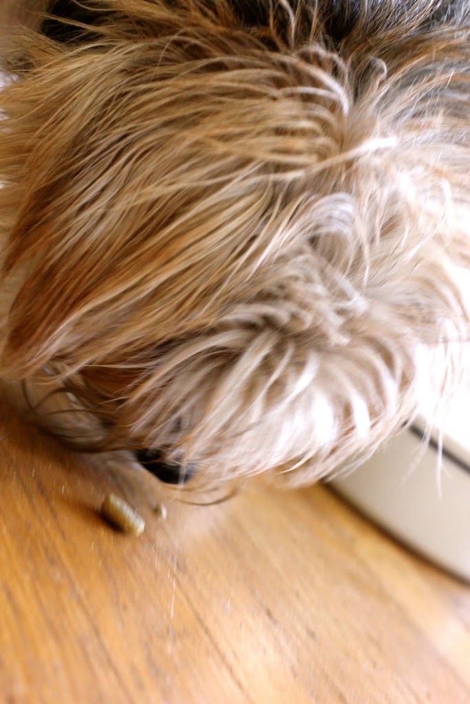| taste tester Lefty sniffing out a V-Dog kibble |