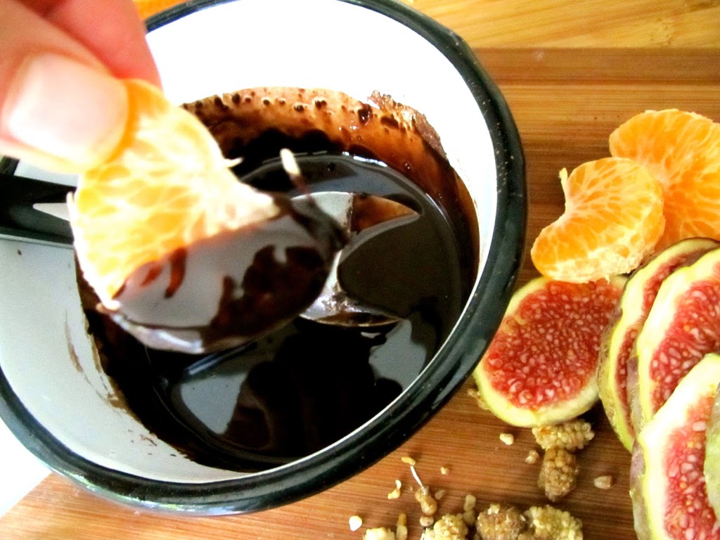 Pick a fruit of your choice - pictured above - Half moons of citrusy Clementines. If you chill it in advance the chocolate/carob will set much quicker and make it easier to make an aesthetic dip (as I learnt after I made it!). They are real fun to make.