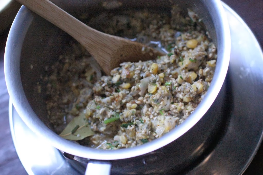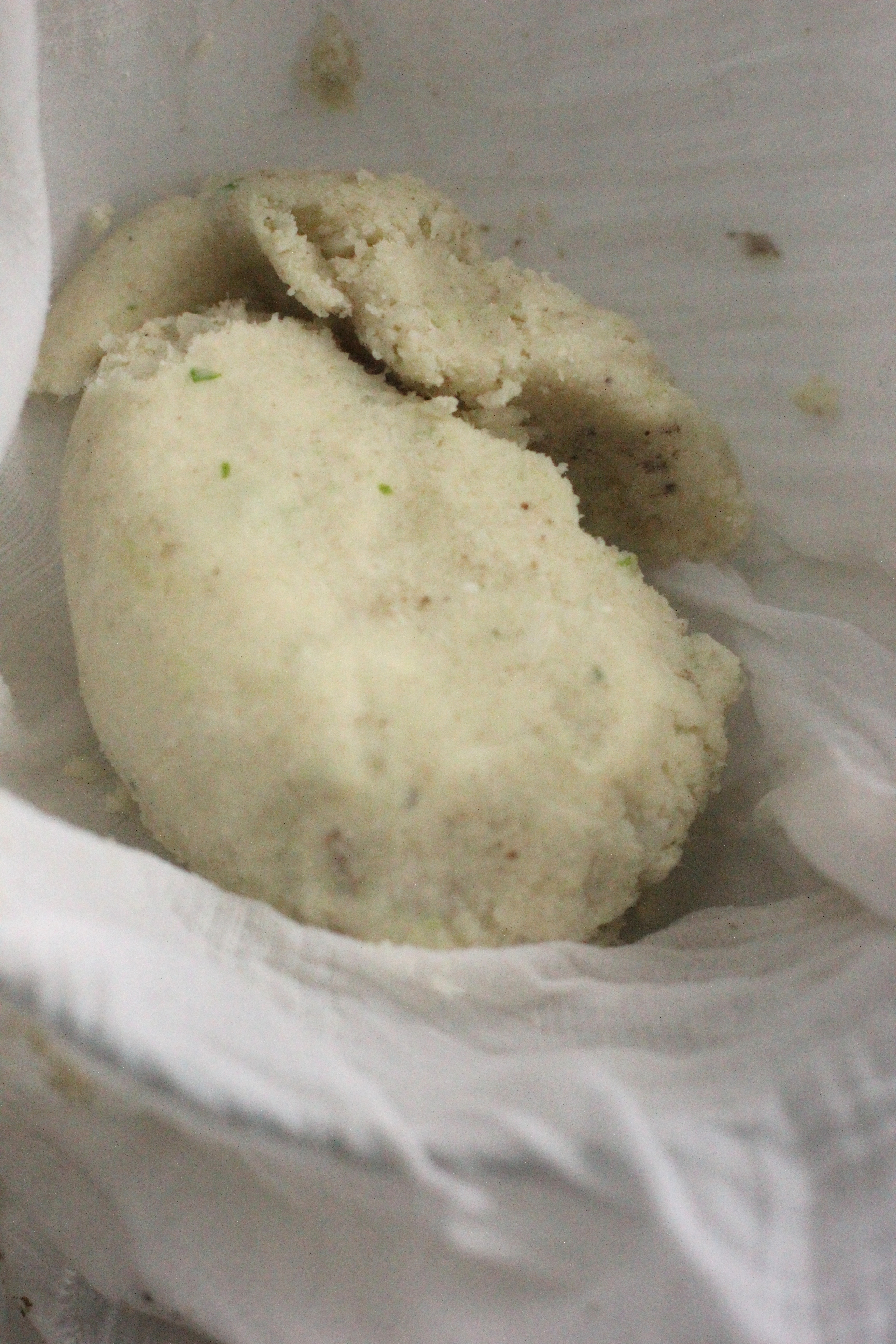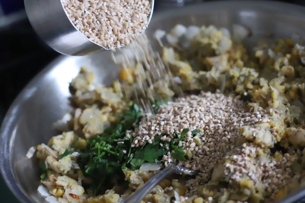 - Combine the drained cauliflower, chia ‘egg’, flours, nutritional yeast, and seasonings. Mix to a dough. If too wet add more flour.
